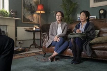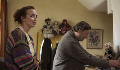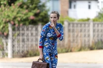 She's looking through the drawers in the kitchen as Julian comes home. He asks what she's doing. She tells him she's looking for a kitchen knife to stab him with. He chuckles and says there is nothing sharp in the house to protect his mother. She asks about the doctor and he frustratedly tells her to stop badgering him. He'll bring back some flu tablets and leaves again. She dials a number, which connects her to Dozen Incorporeated. "It's Cher Horowitz. I've failed my driving test," she says. She is told there is no one available to help her and the call ends. She then calls 999 and tries to be connected to MI6. The operator says they can't disclose that number. Villanelle is connected to an automated call system, which asks her who she wants to be connected to. It doesn't understand her saying Eve's name. She's forced to hang up when Julian comes in again, leaving the phone off the hook. She plunges back onto the couch. Julian forgot something. He notices the phone and removes it from the wall.