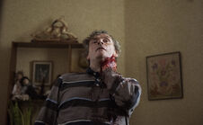 Julian asks Villanelle who she was calling. He thinks she's ungrateful. He knows she's taking advantage of her playing the innocent girl. He takes care of her while he gets nothing from her. She claims she was on the phone with a bakery to order him a cake to thank him for being her knight in shining armor. He falls for her ruse. He gets on his knees and apologizes. She tells him he's going to bleed to death and kicks him in the face. She tries to run off but he grabs her foot. She then goes to strangle him but he punches her in the abdomen, right on her wound, allowing him the chance to overpower her. As he goes to strangle her, she manages to grab a statue and beat him over the head. She breaks free from his grip and flees to the hallway, though the front door is still locked. He chases her and puts her in a headlock. She manages to break free and stabs him in the neck with a knitting needle. As he slowly bleeds to death, she tells him this is what he gets.